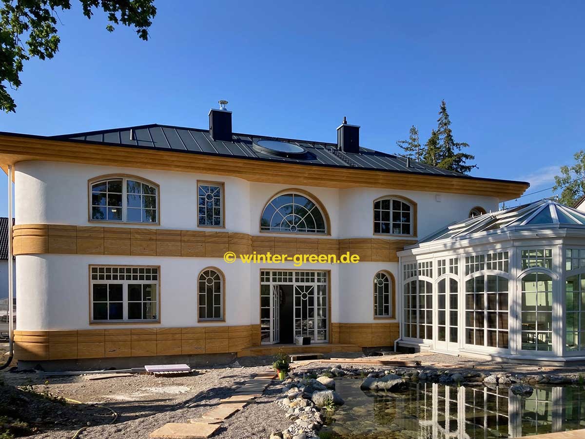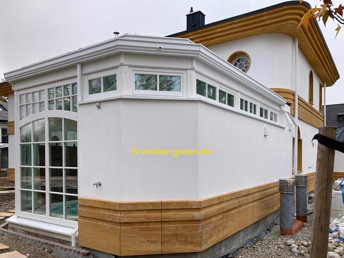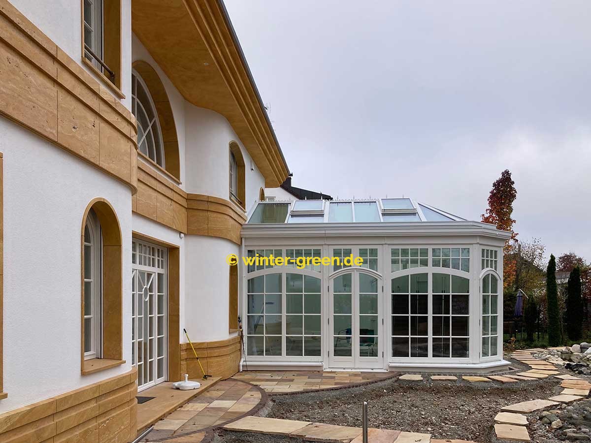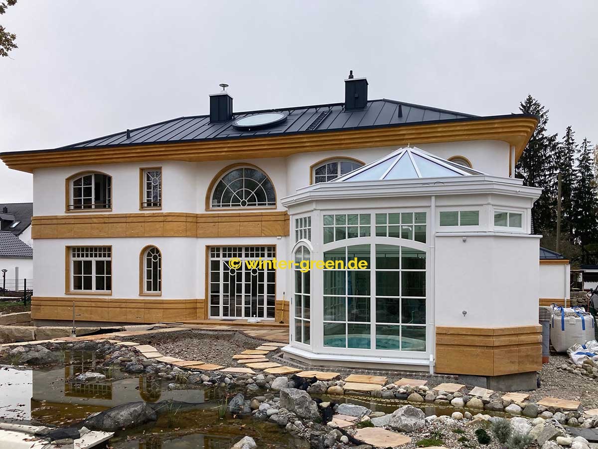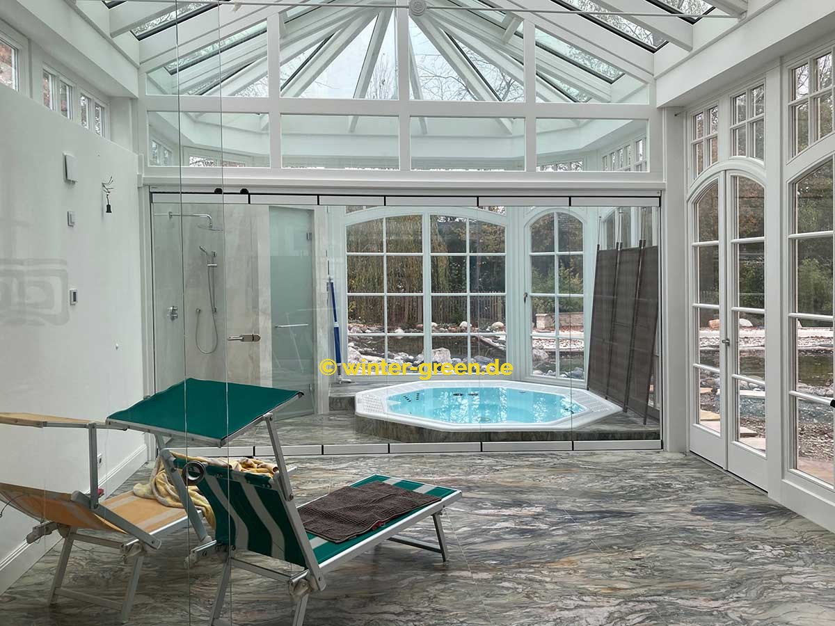Orangerie-Wintergarten mit Segmentbögen als Fitness- und Wellnessbereich, abgetrennt durch eine komplett verschiebbare Glaswand.